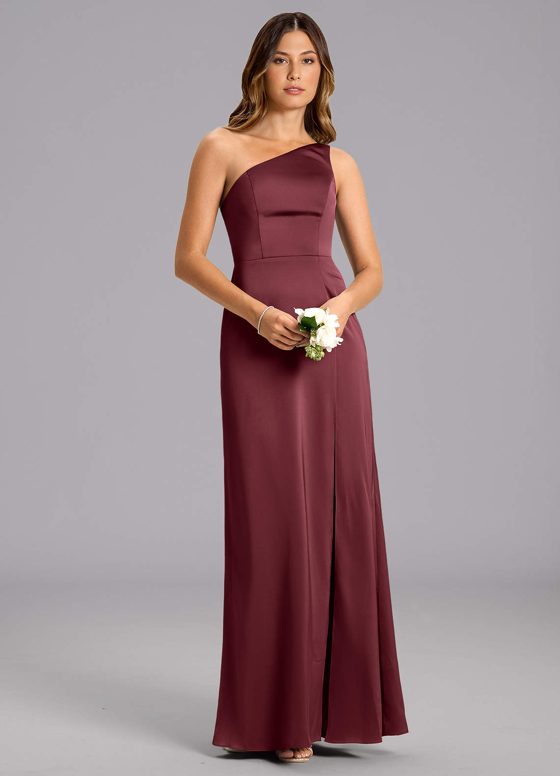 Vestido de Merlot de Satén Elástico de Corte en A con Hombro unilateral
