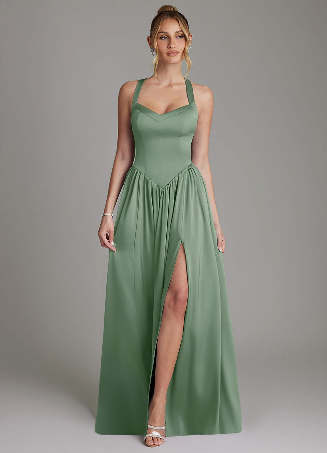 Vestido de Matcha de Satén Elástico de Corte en A con Corsé