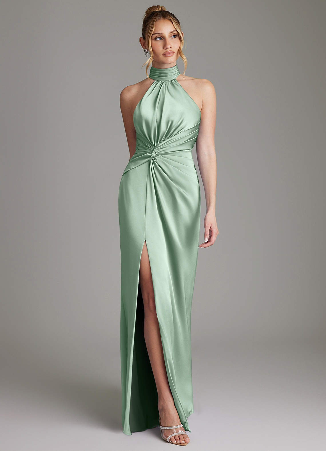 Vestido de Agave de Satén Elástico de Corte Recto con Plisado