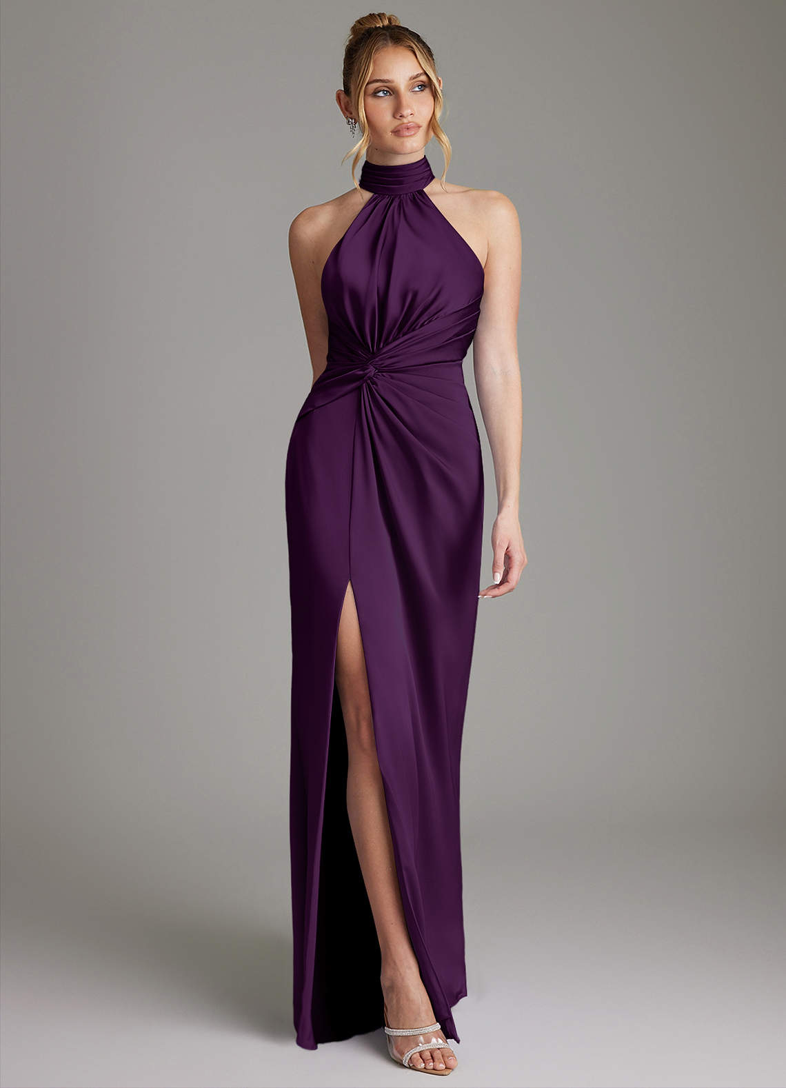 Vestido de Uva de Satén Elástico de Corte Recto con Plisado