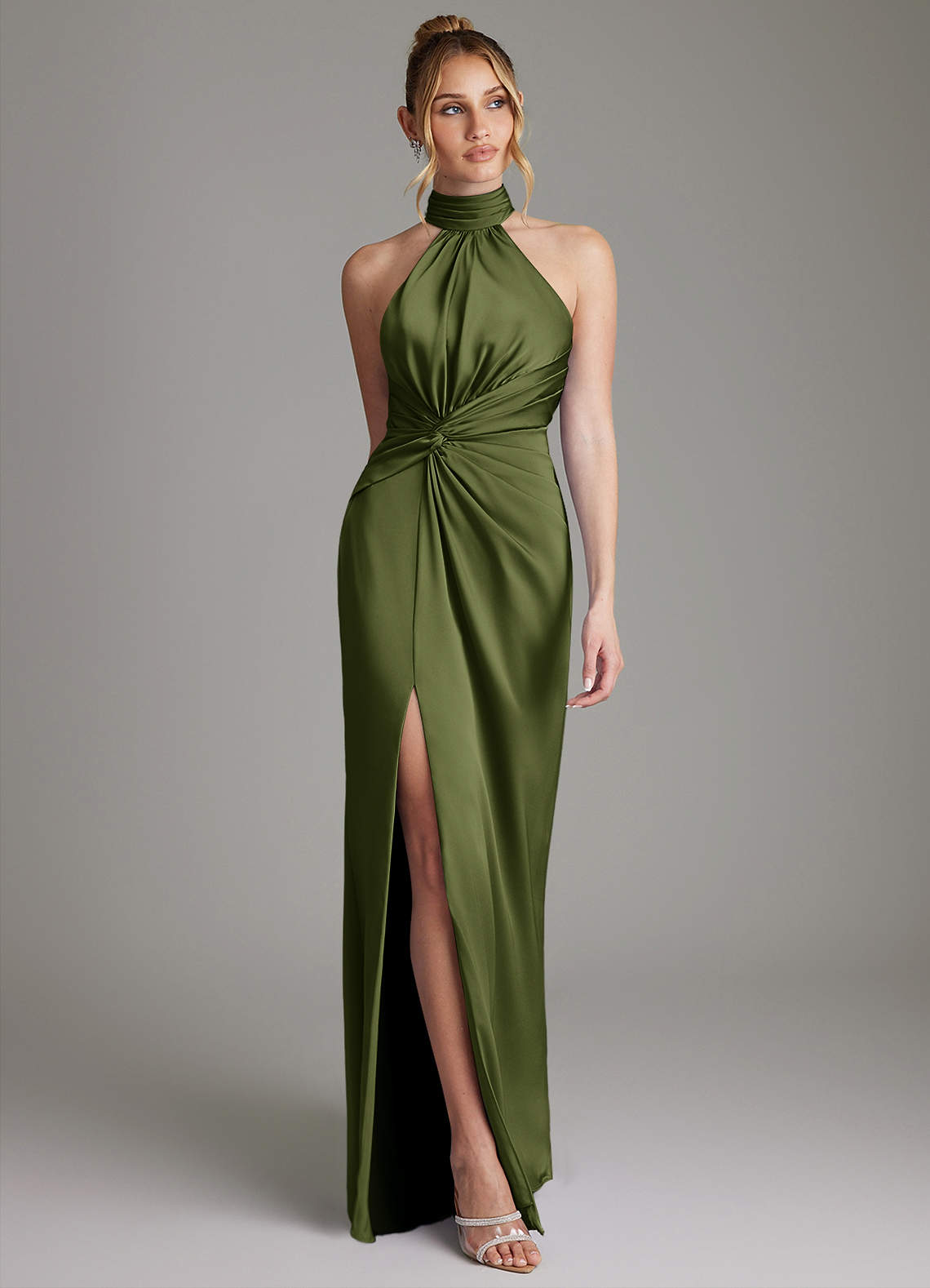Vestido de Oliva de Satén Elástico de Corte Recto con Plisado