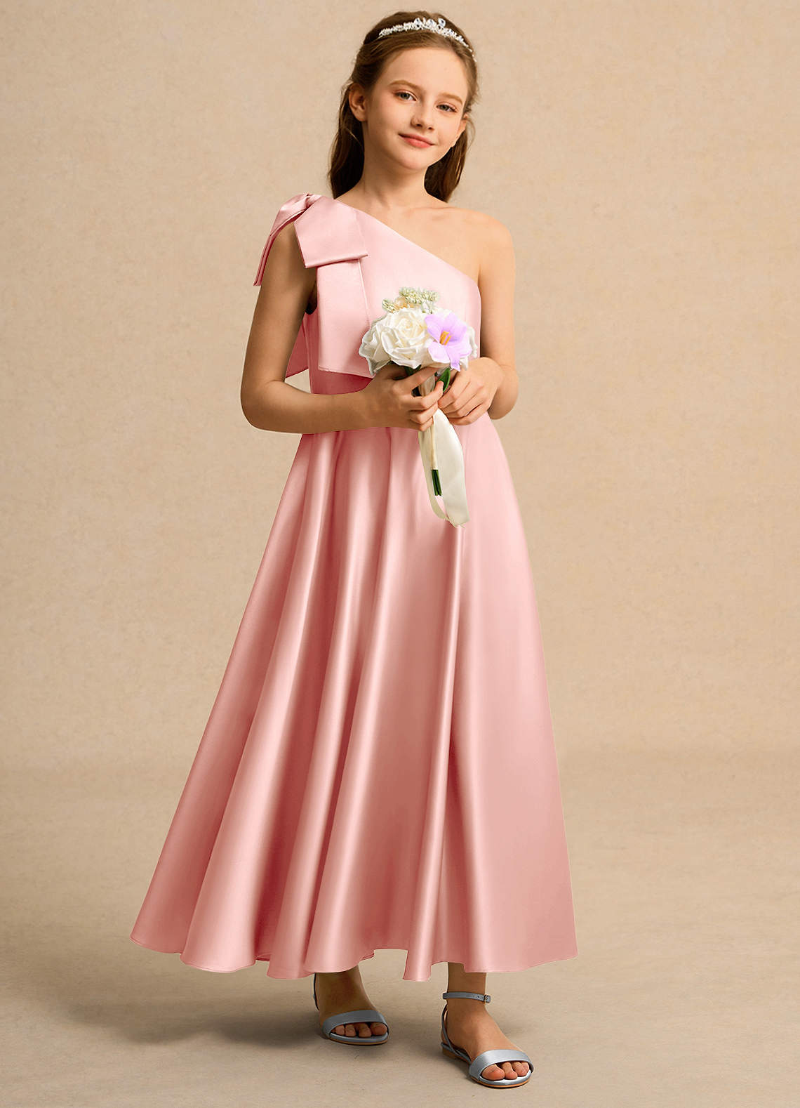 Vestido de Rosetón de Satin Mate de Corte En A con Hombro unilateral