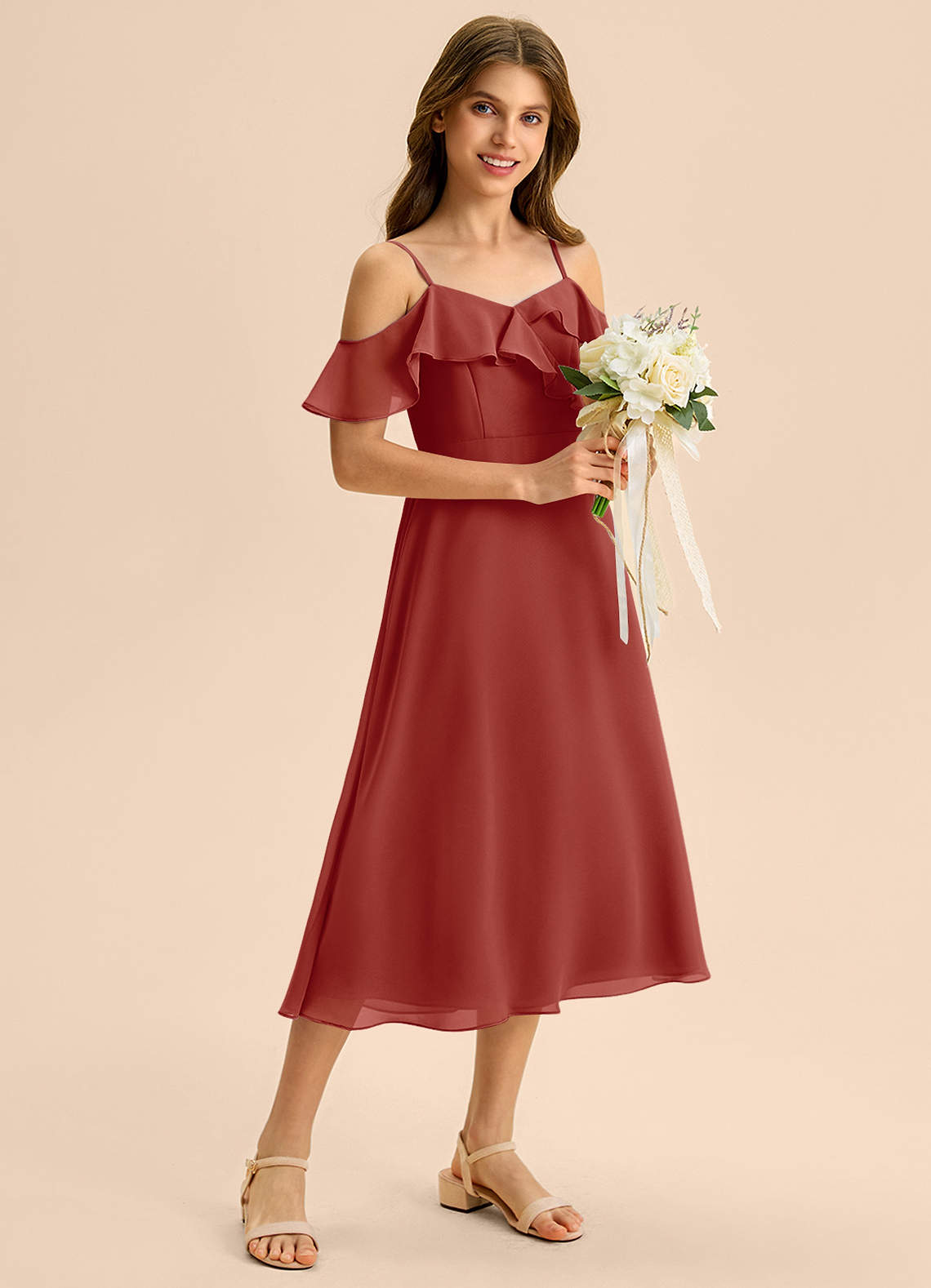 Vestido de Terracota de Gasa de Corte en A con Vestidos sin tirantes