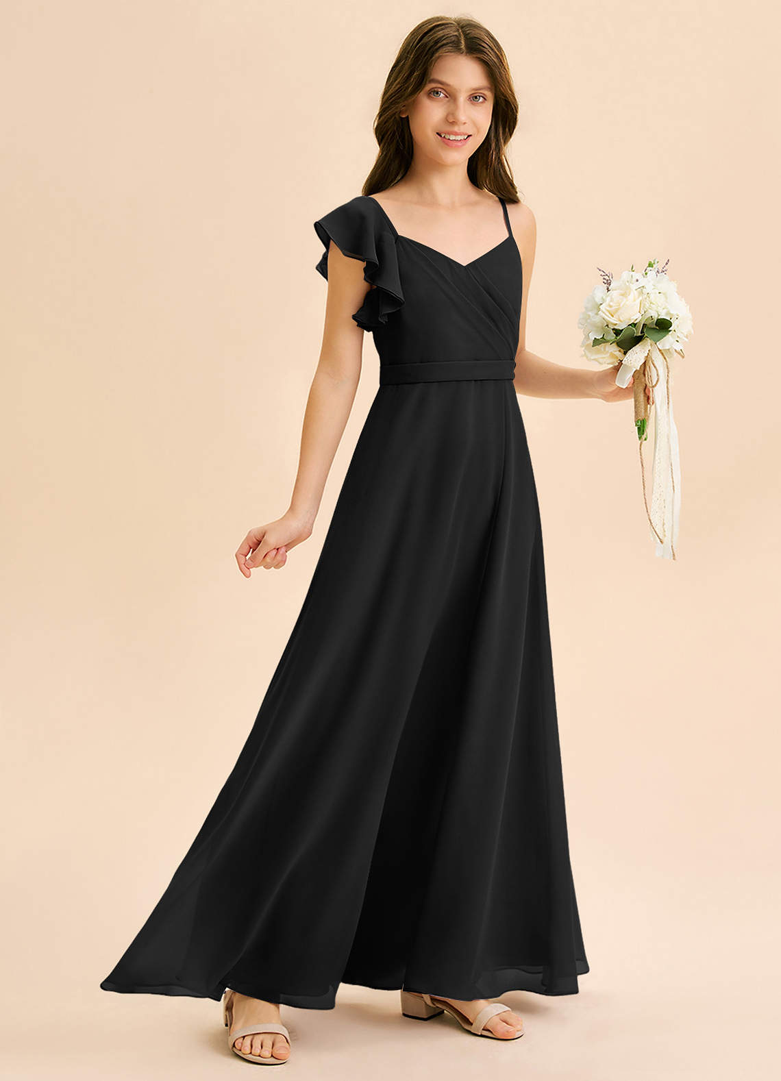Vestido de Negro de Gasa de Corte en A con Volante