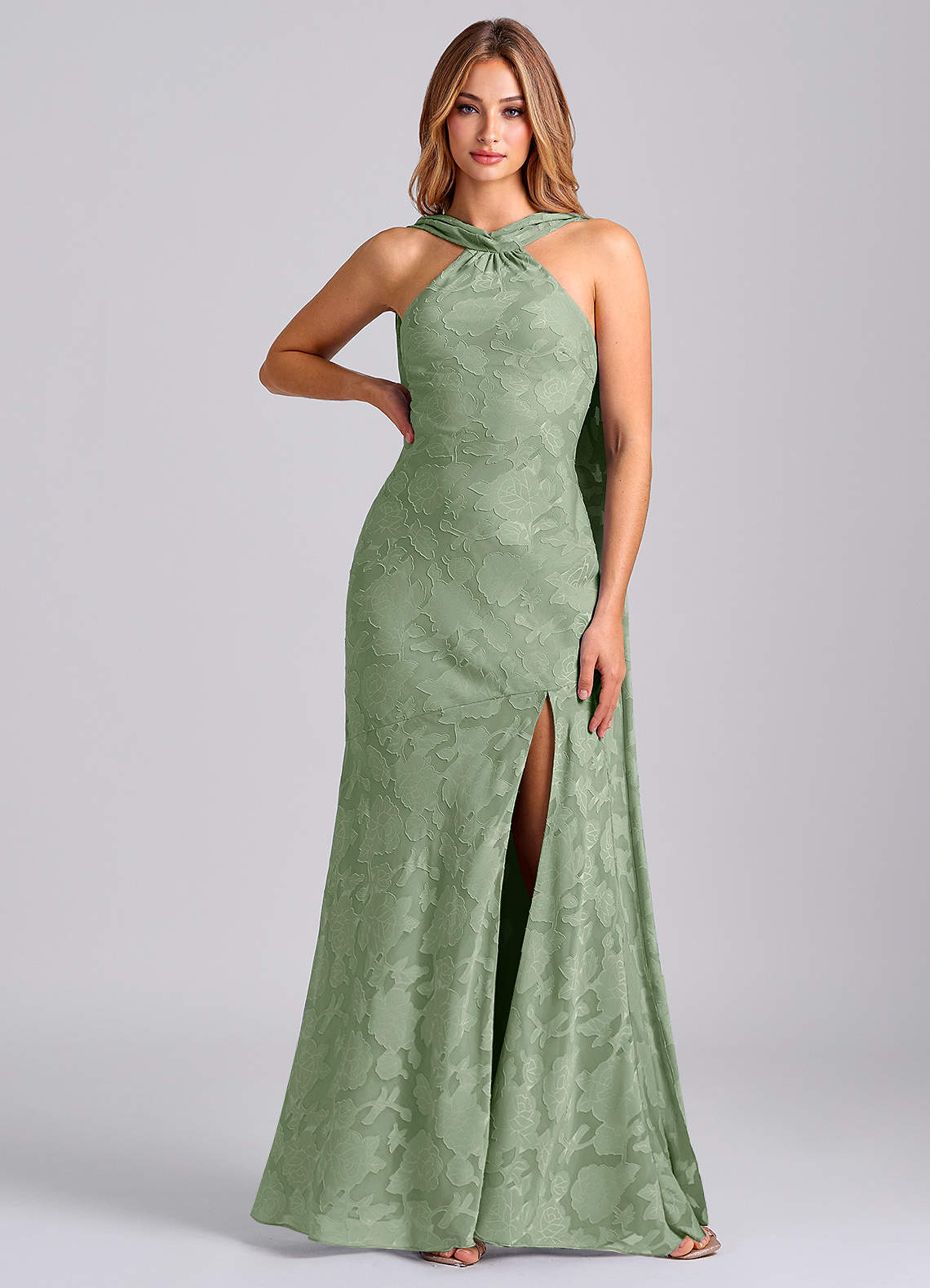 Vestido de Salvia Polvorienta de Devorado Floral de Corte Sirena con Plisado