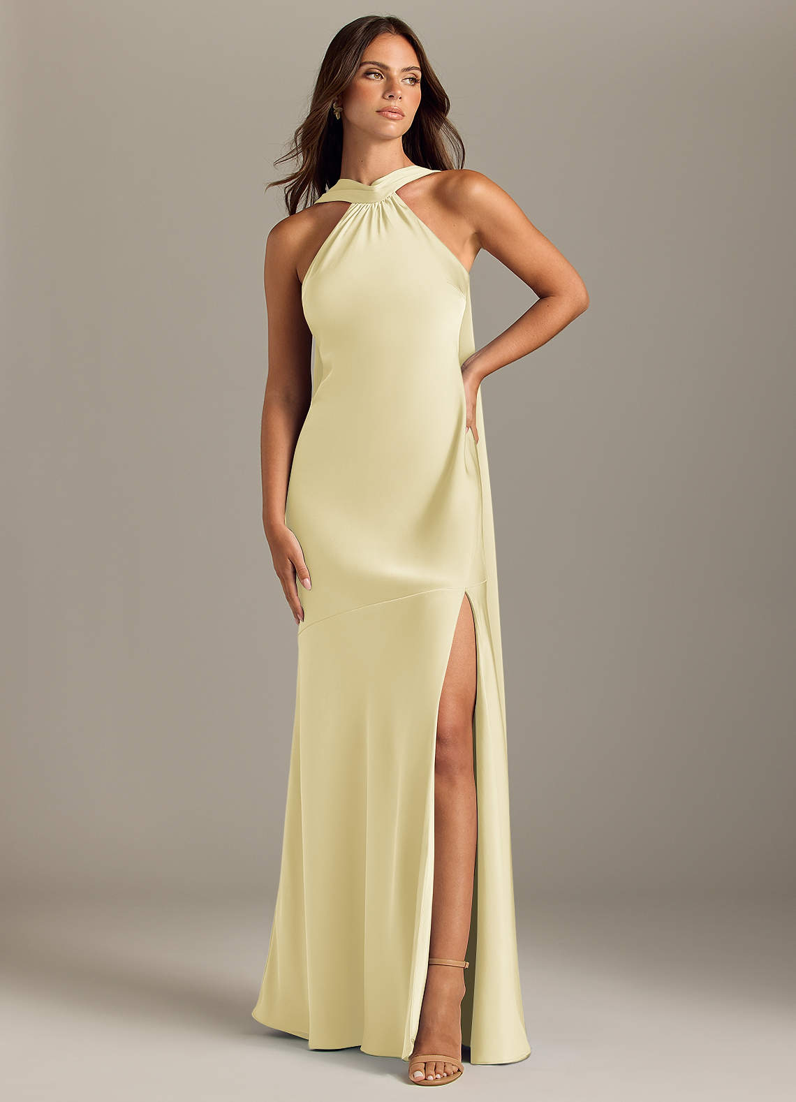 Vestido de Sorbete De Limón de Satén Elástico de Corte Sirena con Corte Lateral