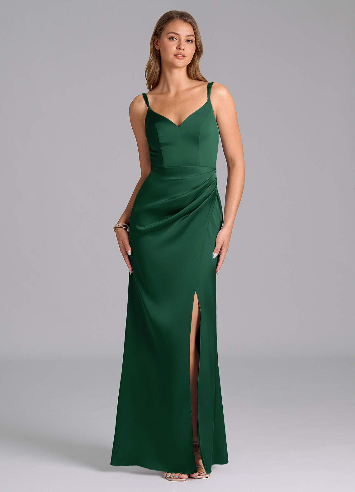 Vestido de Verde Oscuro de Satén Elástico de Corte Recto con Plisado