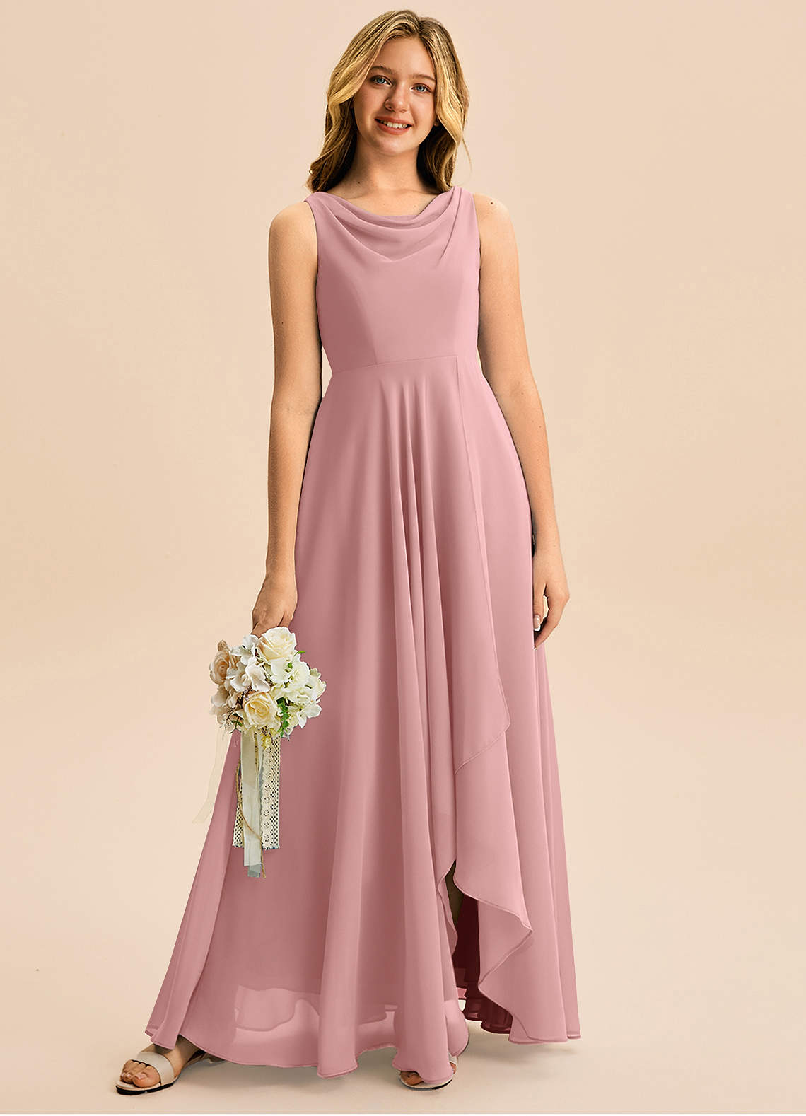 Vestido de Rosa Polvorienta de Gasa de Corte en A con Plisado