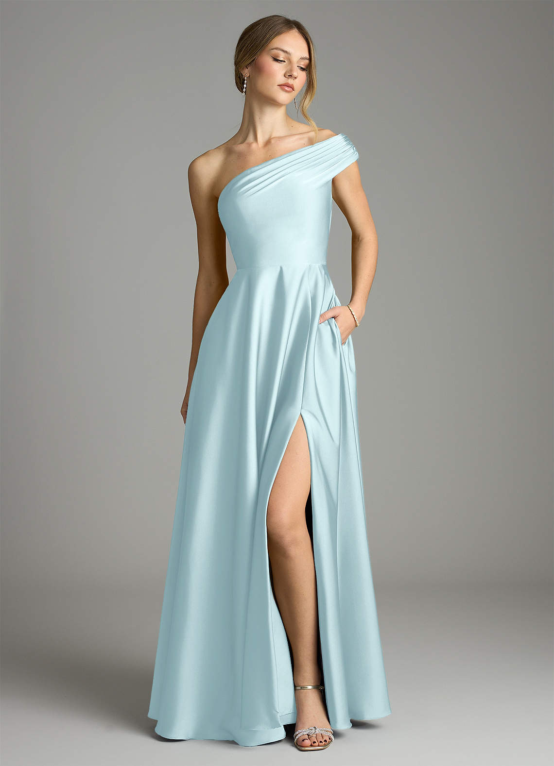 Vestido de Azul Nube de Satén Elástico de Corte en A con Vestidos sin tirantes
