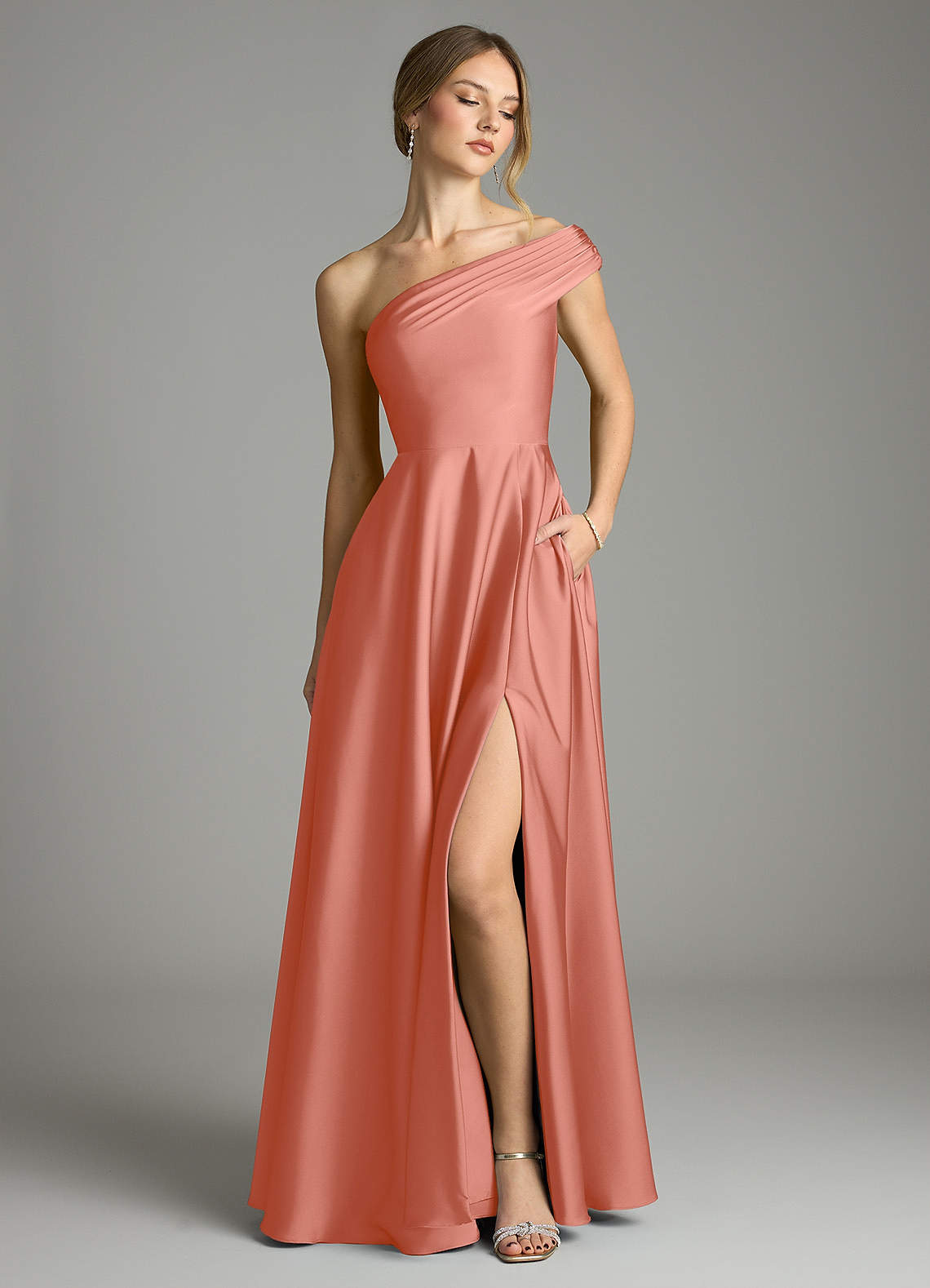 Vestido de Rosa Salmón de Satén Elástico de Corte en A con Vestidos sin tirantes