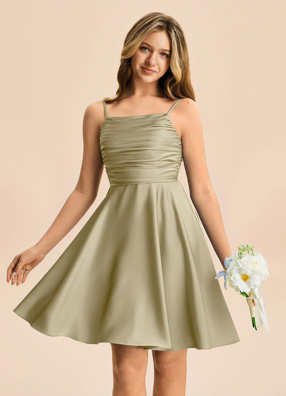 Vestido de Musgo Verde de Satén Elástico de Corte en A con Plisado