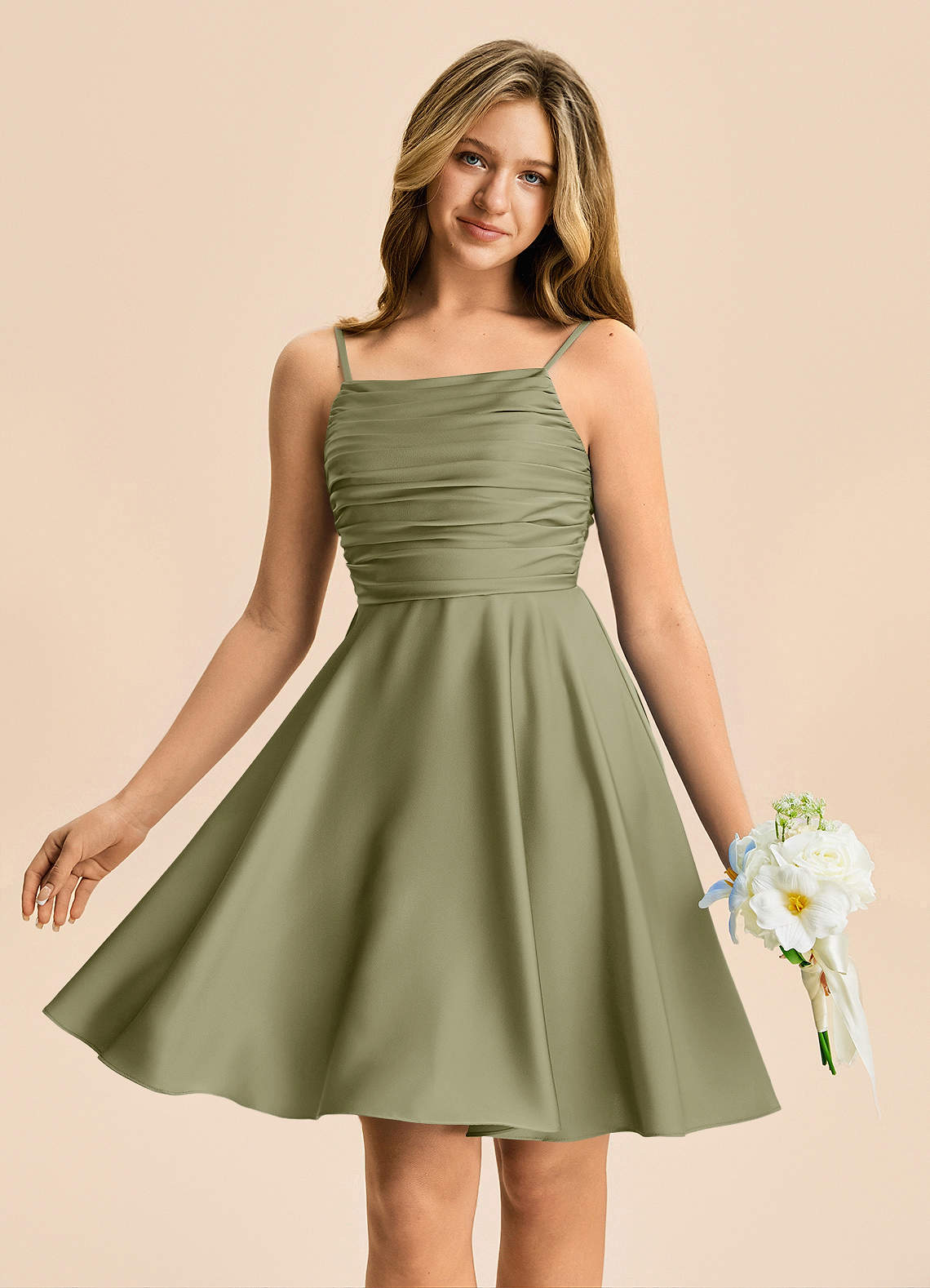 Vestido de Pistacho de Satén Elástico de Corte en A con Plisado