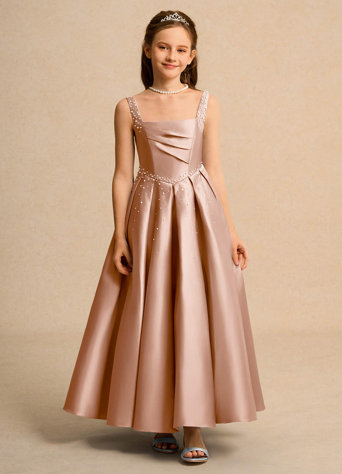 Vestido de Champán Rosado de Satin Mate de Princesa con Plisado