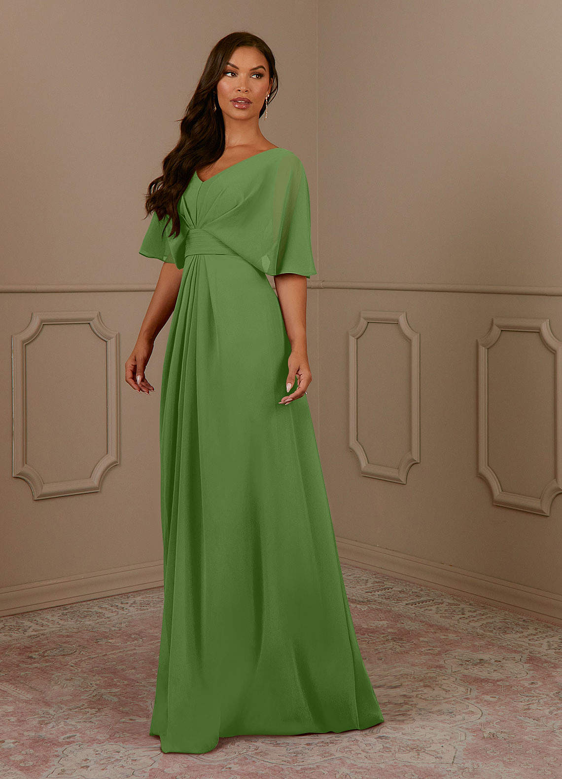 Vestido de Albahaca de Gasa de Corte en A con Cuello en V Plisado