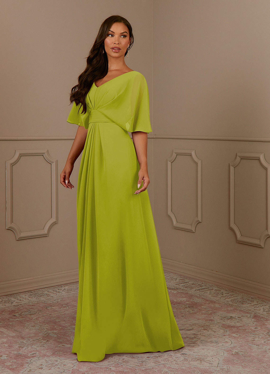 Vestido de Hierba De Limón de Gasa de Corte en A con Cuello en V Plisado