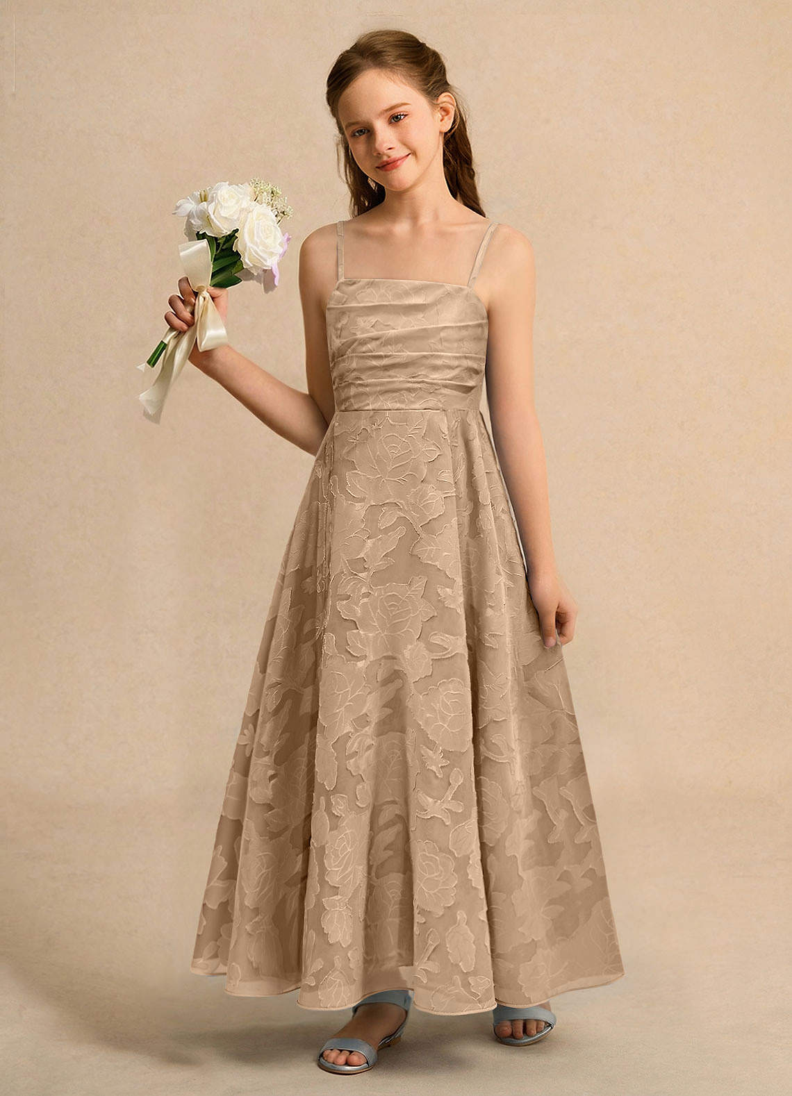 Vestido de Champán de Devorado Floral de Corte En A con Plisado