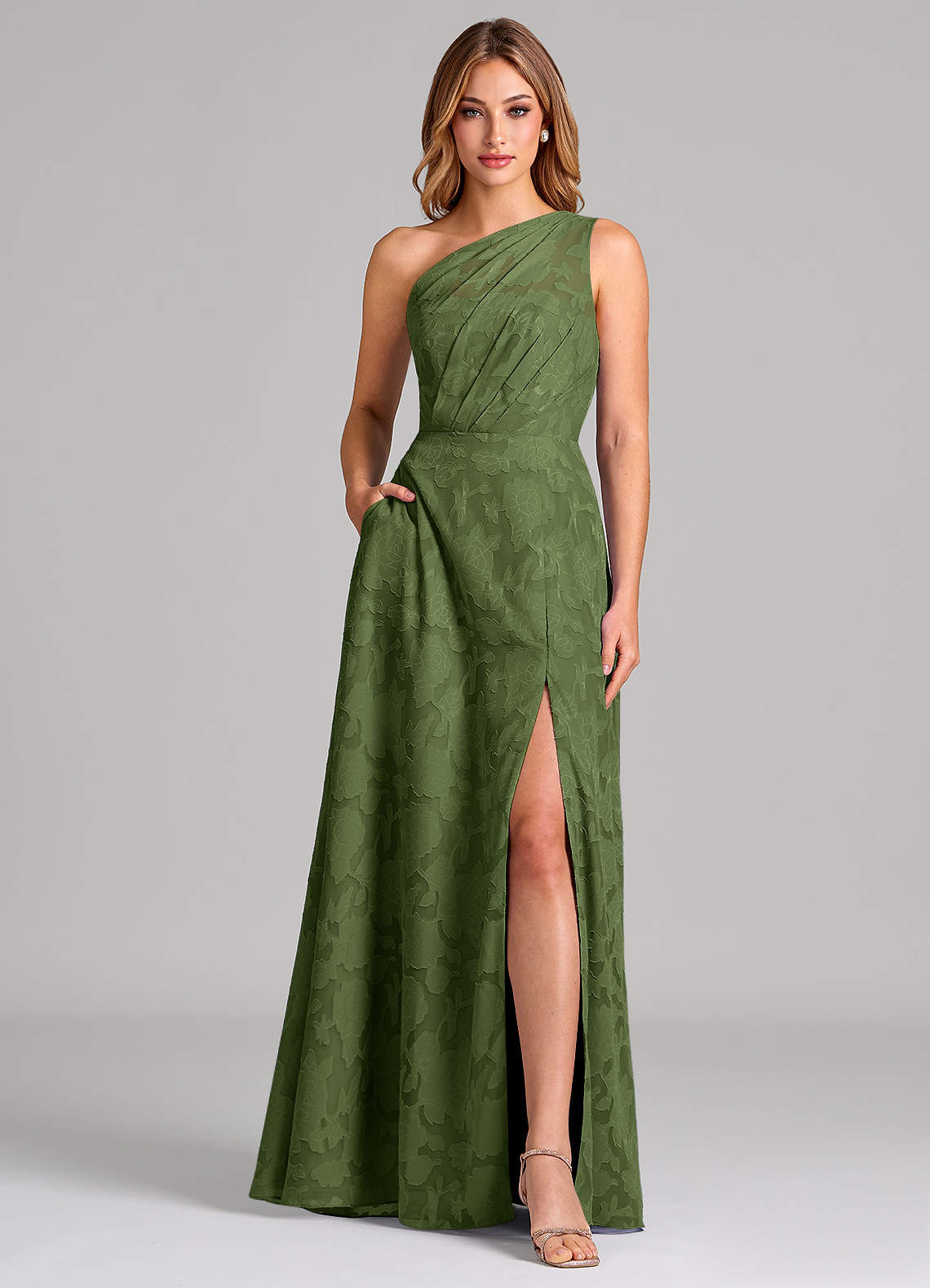 Vestido de Oliva de Devorado Floral de Corte en A con Hombro unilateral