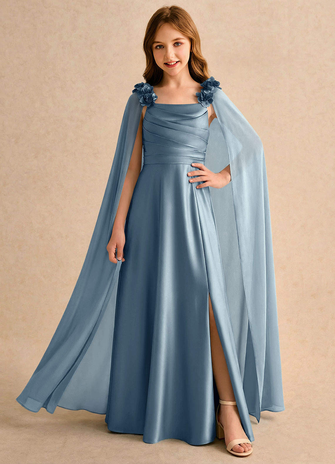 Vestido de Azul Polvoriento de Satén Elástico de Corte en A con Plisado