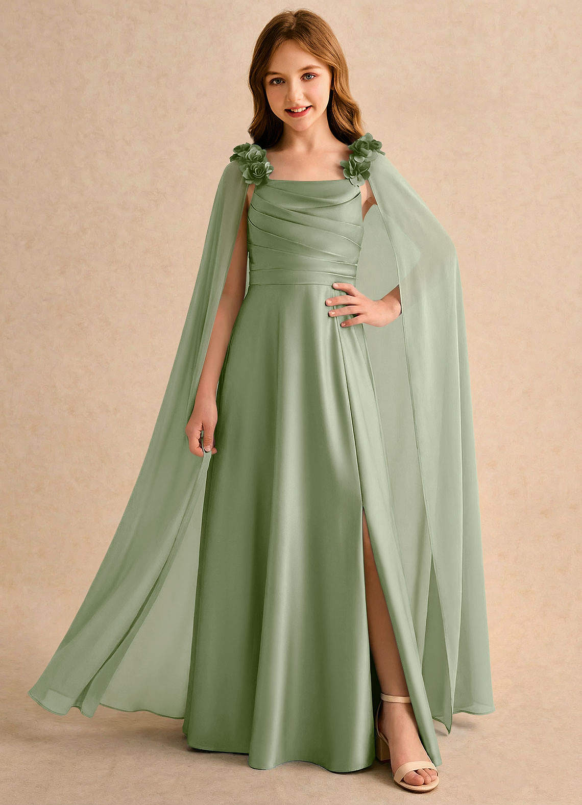 Vestido de Salvia Polvorienta de Satén Elástico de Corte en A con Plisado