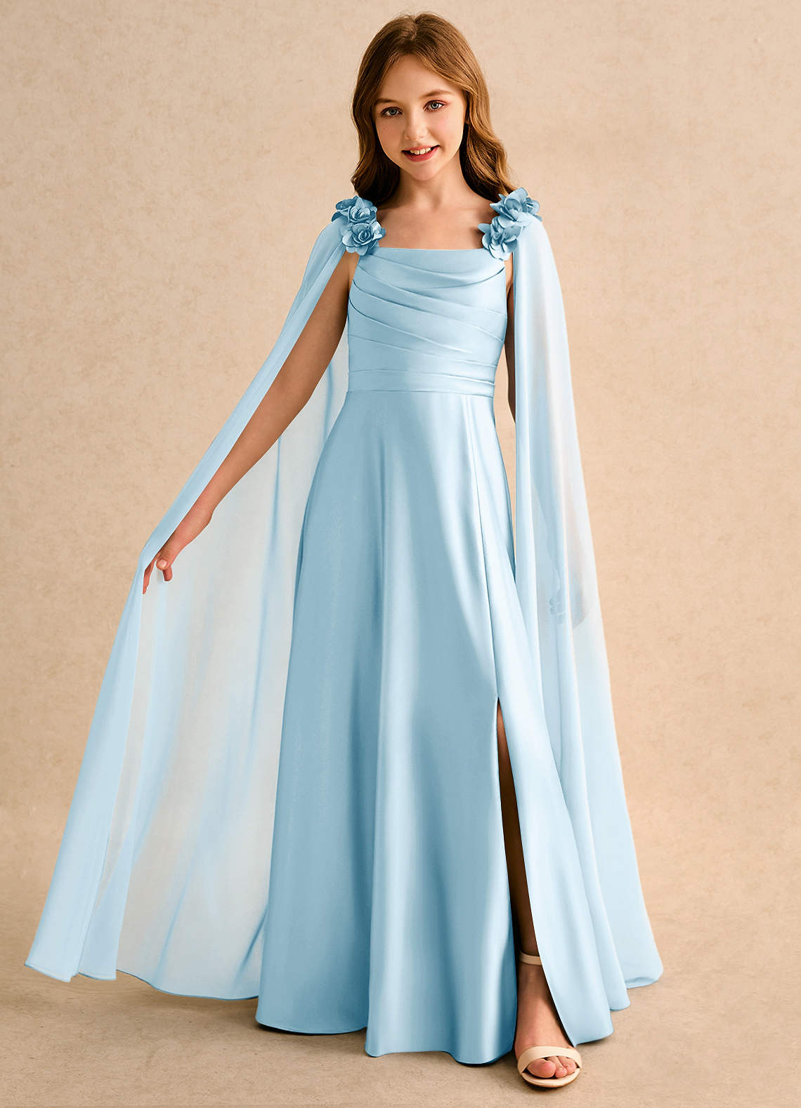 Vestido de Azul Cielo de Satin Mate de Corte en A con Plisado