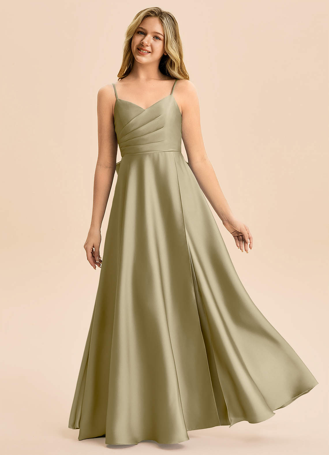 Vestido de Musgo Verde de Satén Elástico de Corte en A con Plisado