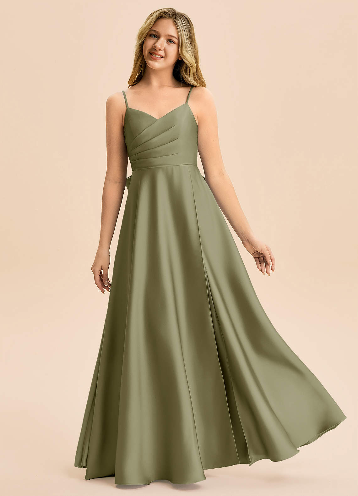 Vestido de Pistacho de Satén Elástico de Corte en A con Plisado
