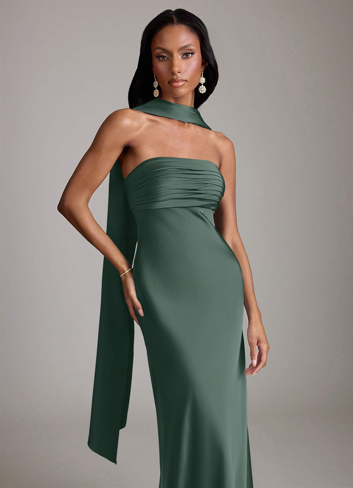 Vestido de Musgo Marino de Satén Elástico de Corte Sirena con Sin tirantes