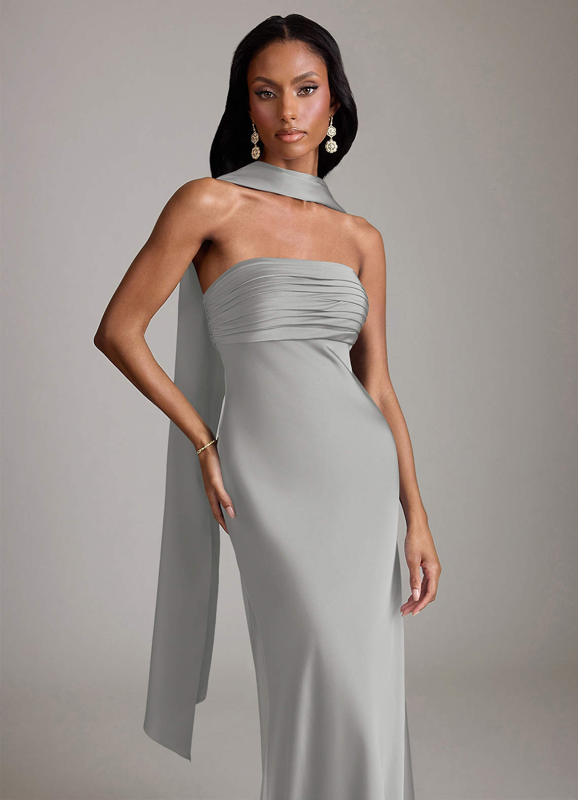 Vestido de Plata de Satén Elástico de Corte Sirena con Sin tirantes