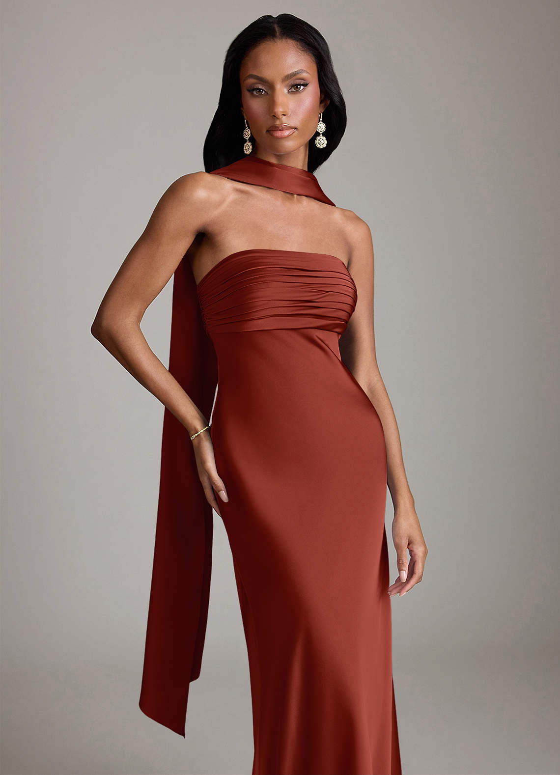 Vestido de Terracota de Satén Elástico de Corte Sirena con Sin tirantes
