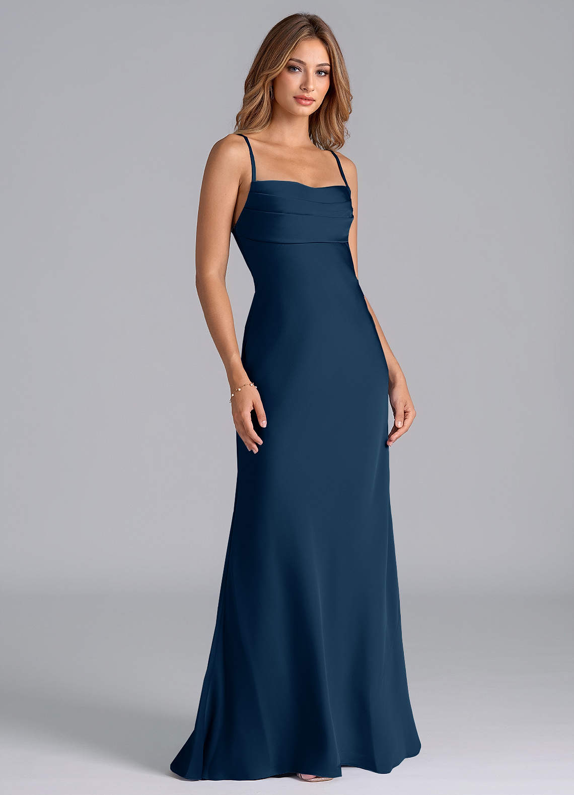 Vestido de Azul Marino Oscuro de Satén Elástico de Corte Sirena con Corsé
