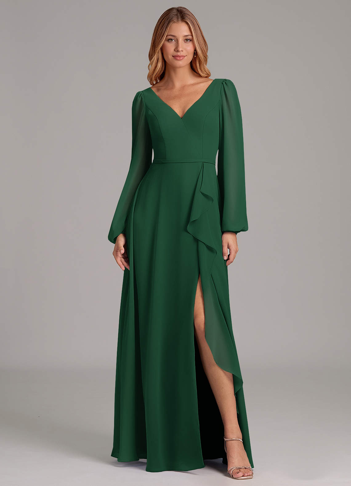 Vestido de Verde Oscuro de Gasa de Corte en A con Manga larga