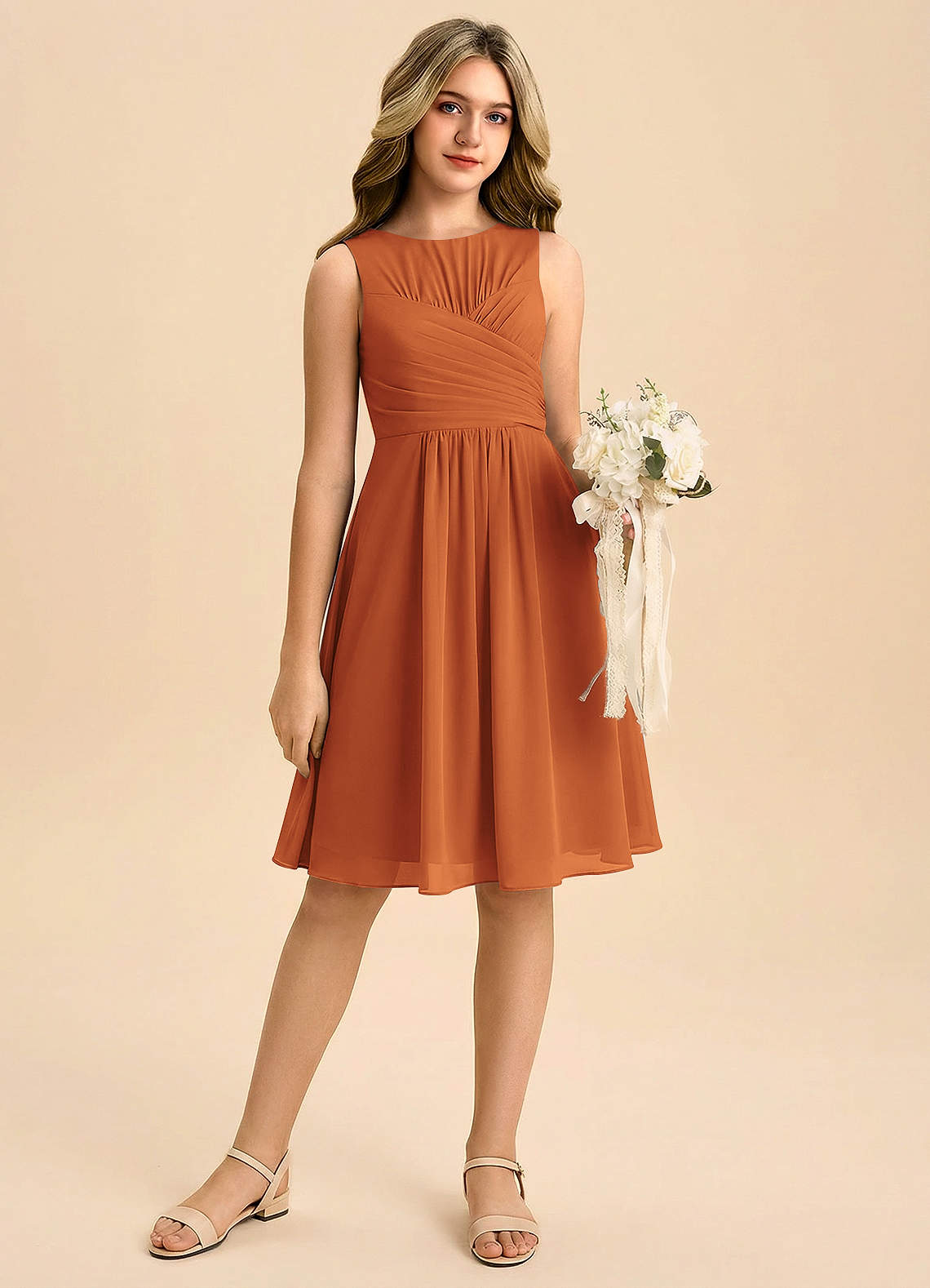 Vestido de Canela de Gasa de Corte en A con Plisado