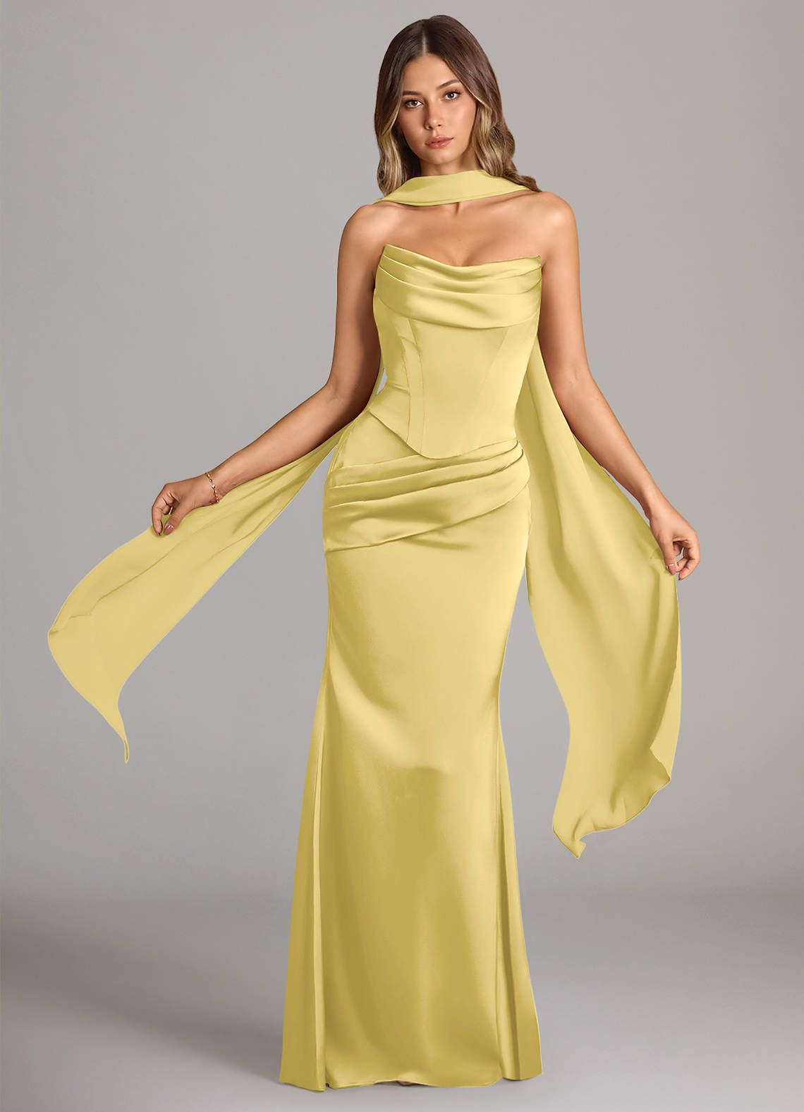 Vestido de Canario de Satén Elástico de Corte Sirena Convertible con Sin tirantes