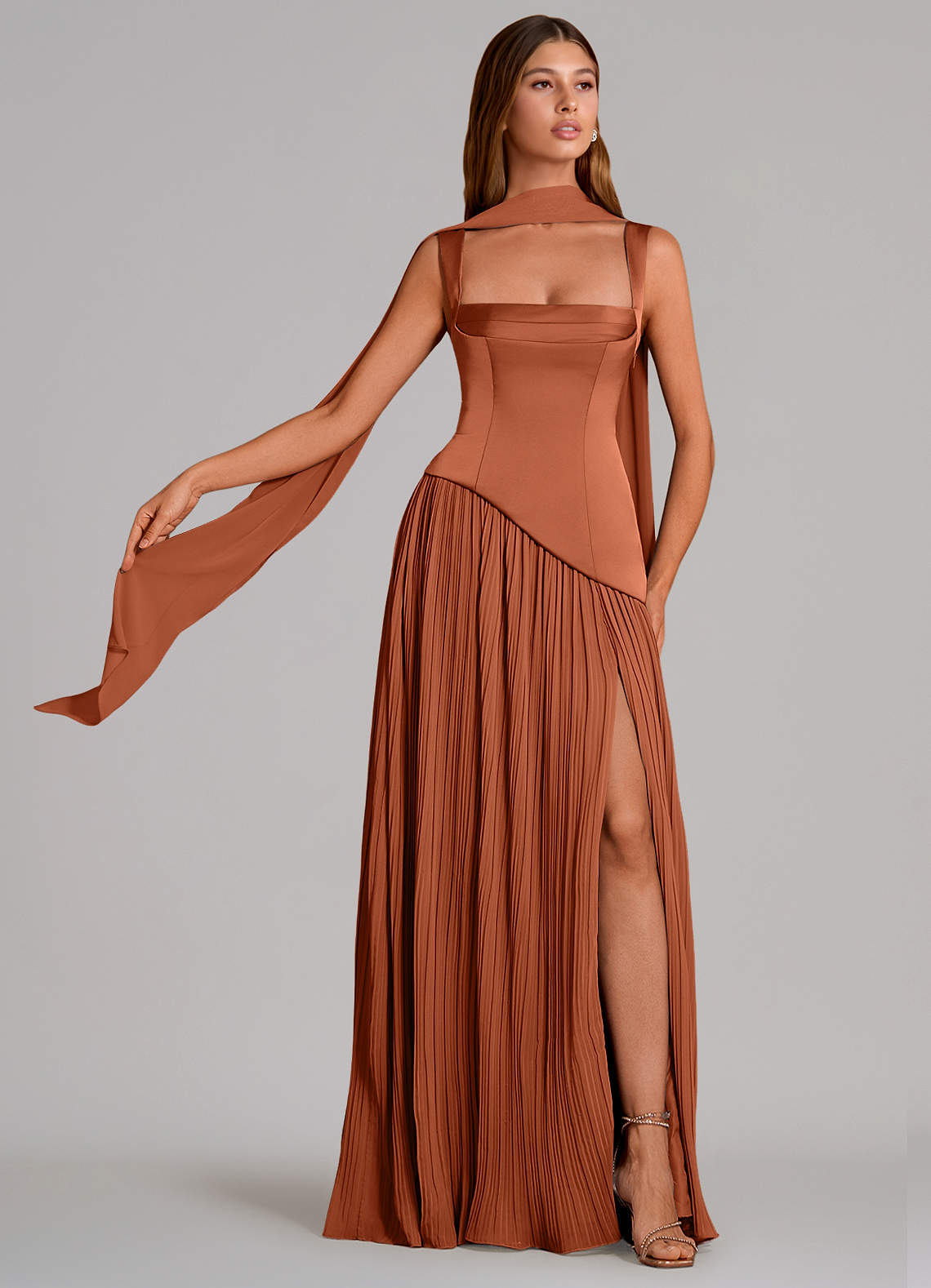 Vestido de Rosa De Cedro de Satén Elástico de Corte en A con Plisado
