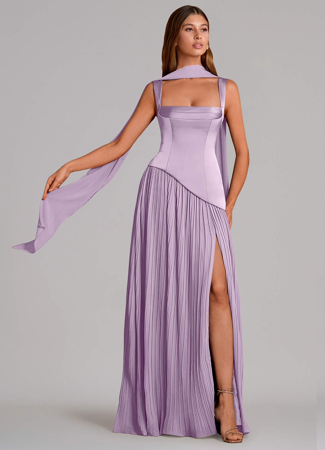 Vestido de Lila Esmerilada de Satén Elástico de Corte en A con Plisado