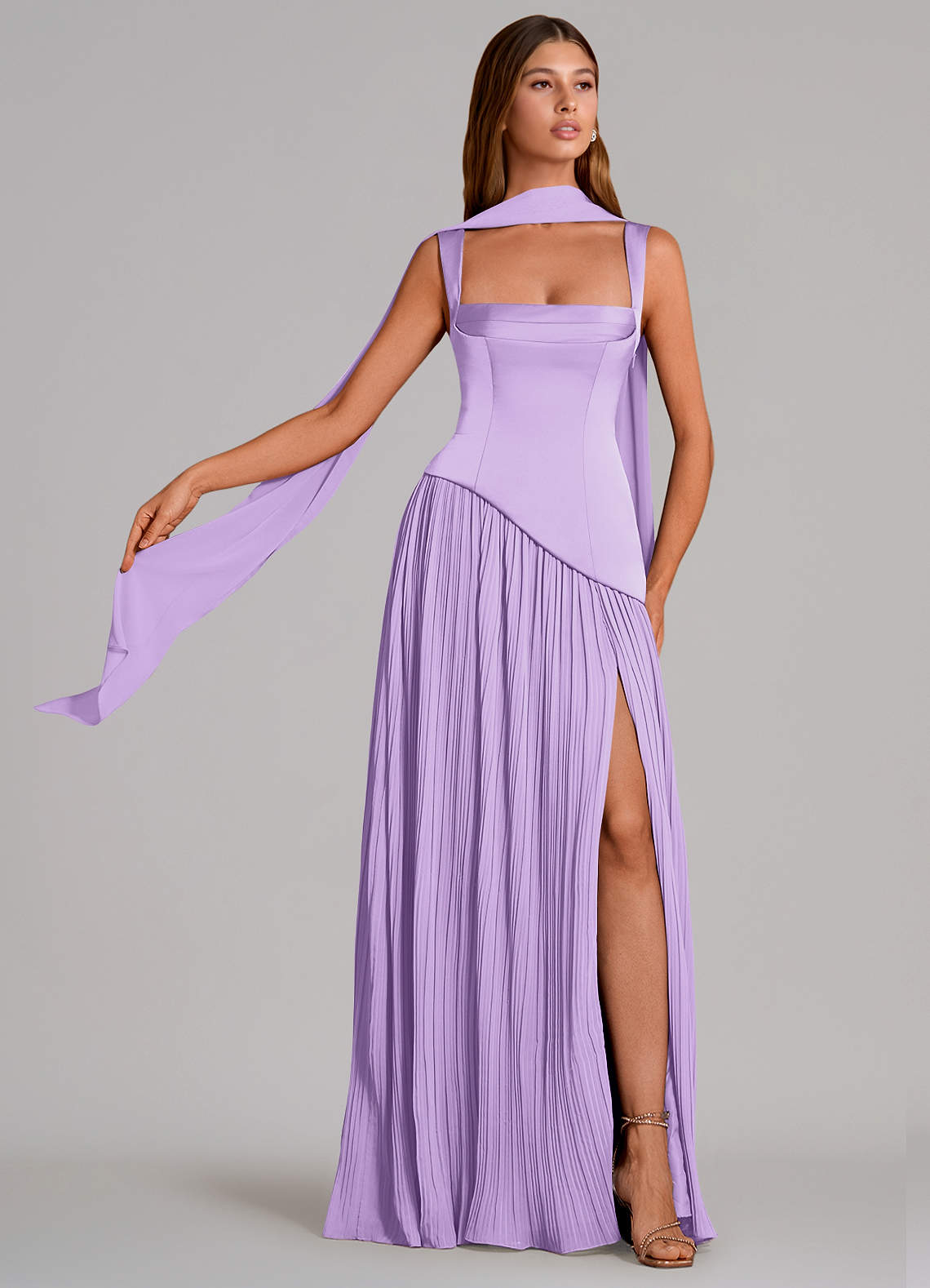 Vestido de Lila de Satén Elástico de Corte en A con Plisado