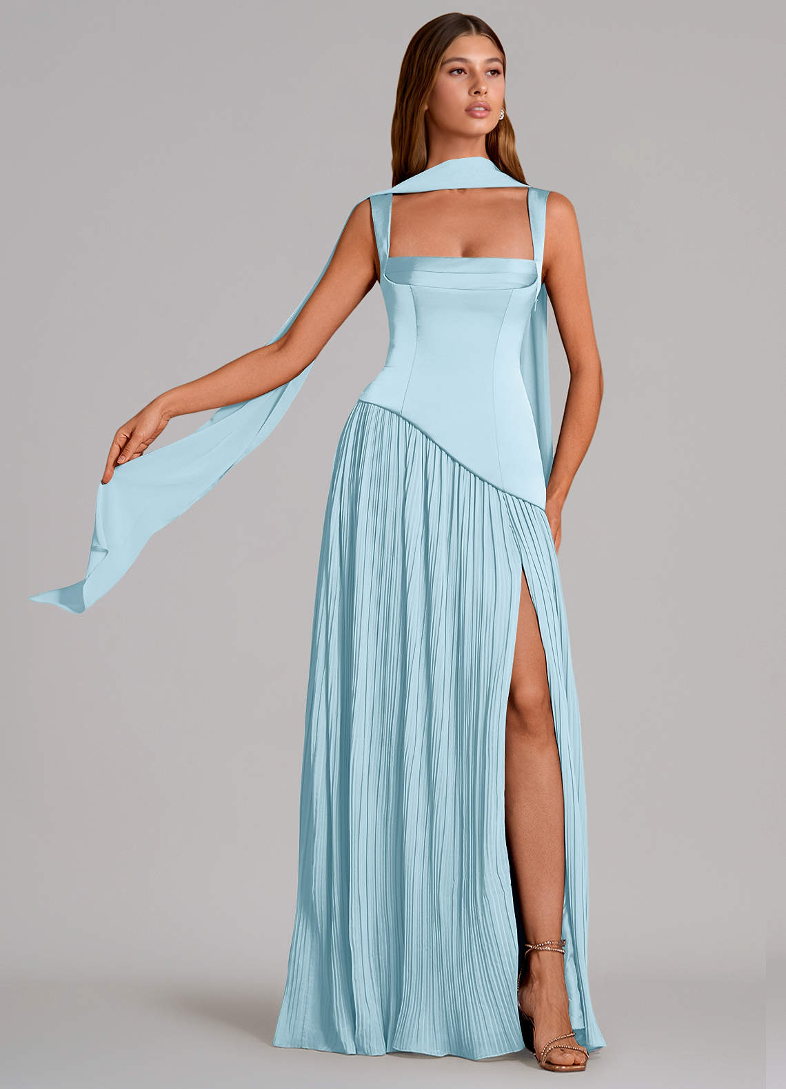 Vestido de Azul Cielo de Satén Elástico de Corte en A con Plisado