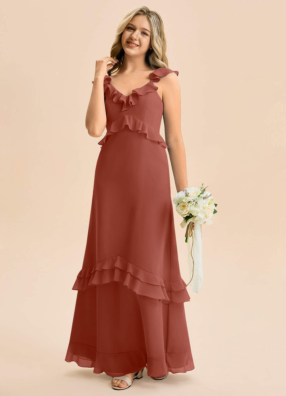 Vestido de Castaño de Gasa de Corte en A con Volante