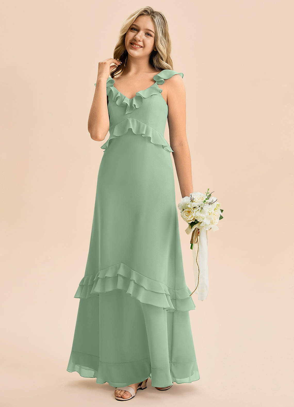 Vestido de Matcha de Gasa de Corte en A con Volante