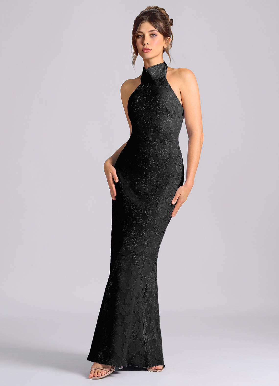 Vestido de Negro de Devorado Floral de Corte Sirena con Cuello Alto