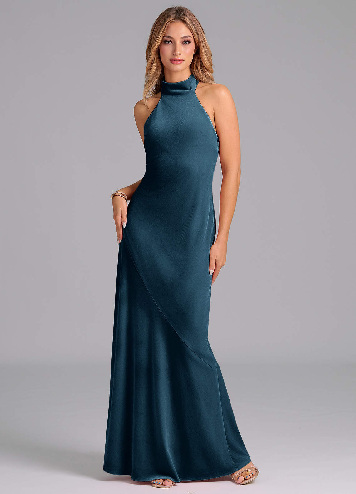 Vestido de Topacio Azul de terciopelo de Corte Sirena con Cuello Alto