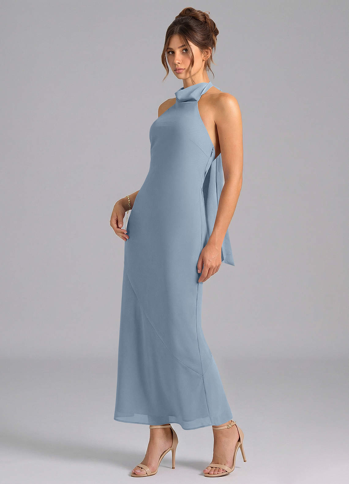 Vestido de Azul Polvoriento de Gasa de Corte Sirena con Cuello Alto