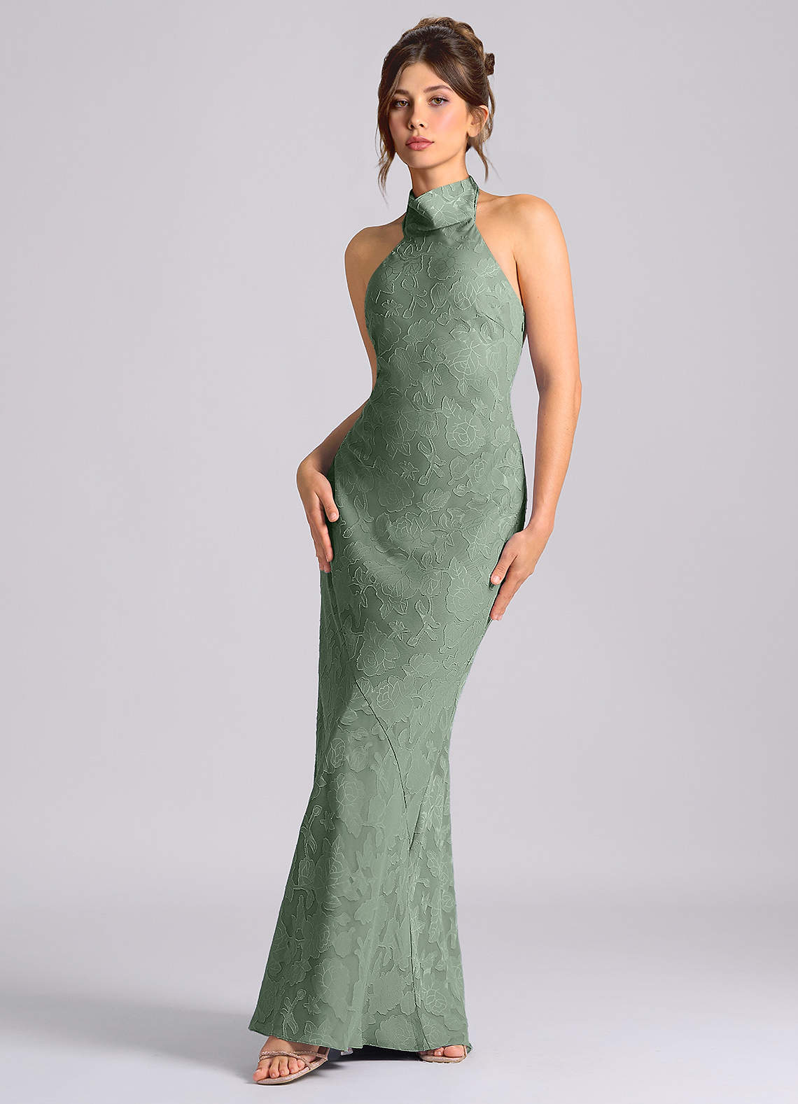 Vestido de Matcha de Devorado Floral de Corte Sirena con Cuello Alto