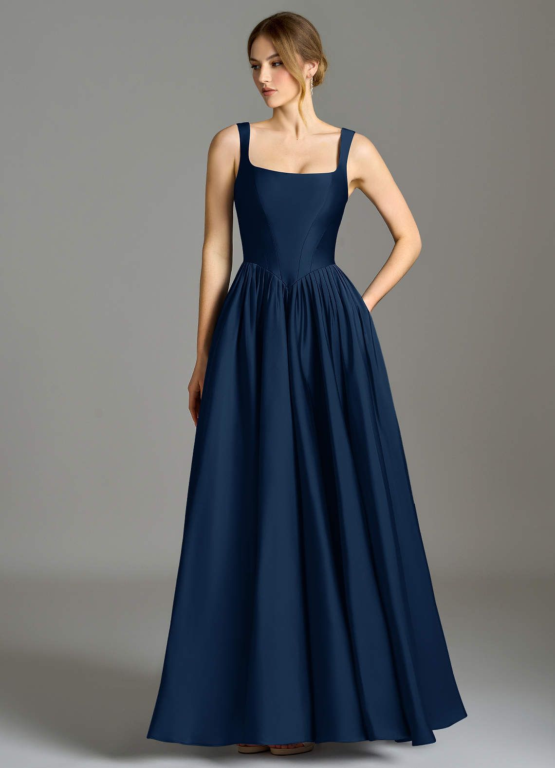 Vestido de Azul Marino Oscuro de Satén Elástico de Corte en A con Plisado