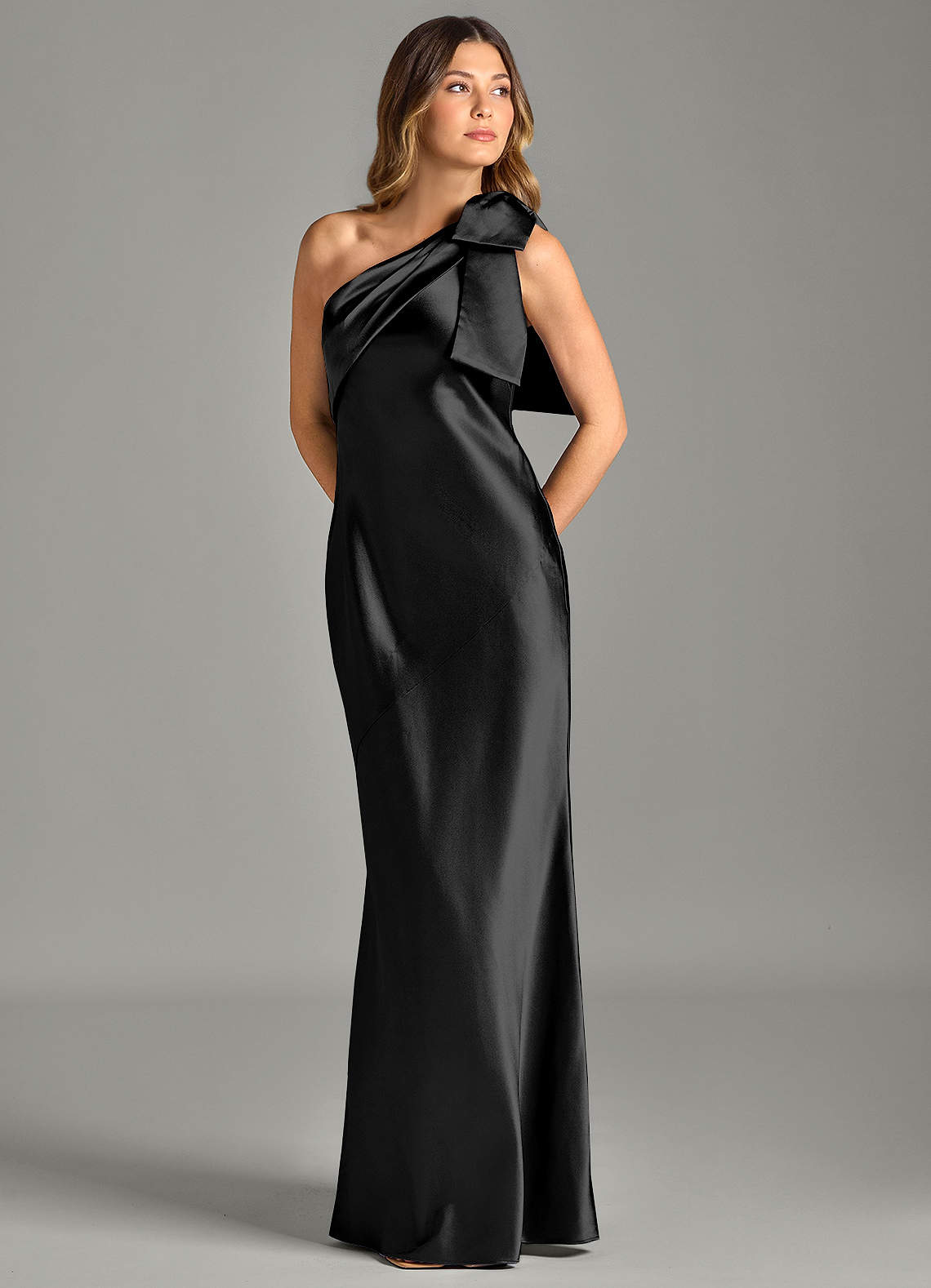 Vestido de Negro de Satén Metálico de Corte Sirena con Hombro unilateral