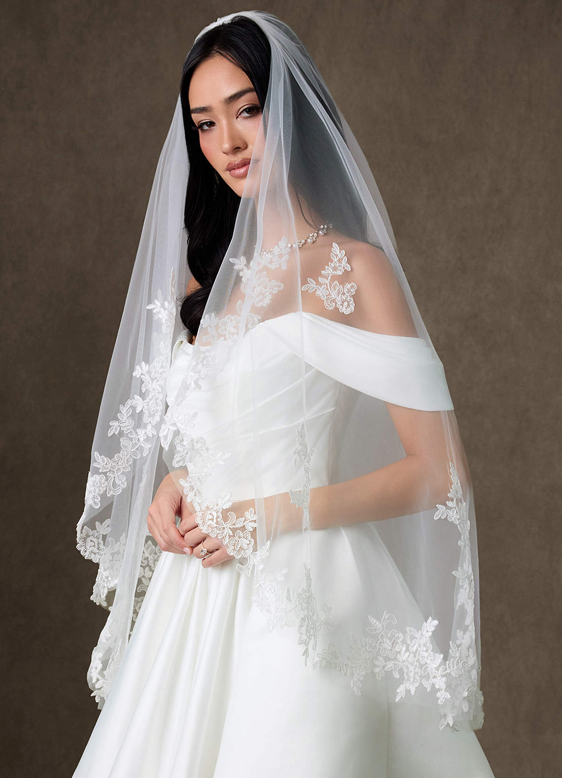 Velo de encaje con borde de pétalos florecidos hasta la punta de los dedos