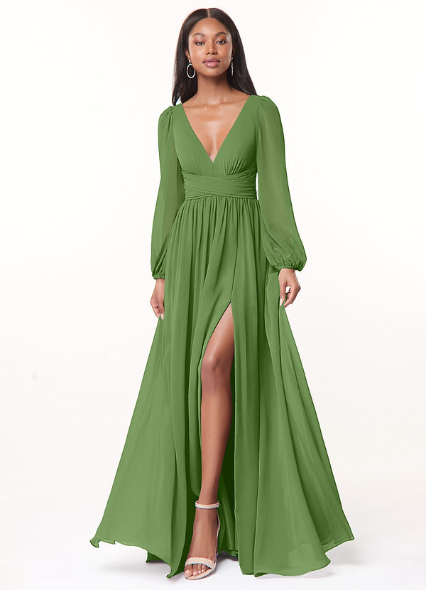 Robe Trapèze en Mousseline de soie Col en V, manches longues Basilic