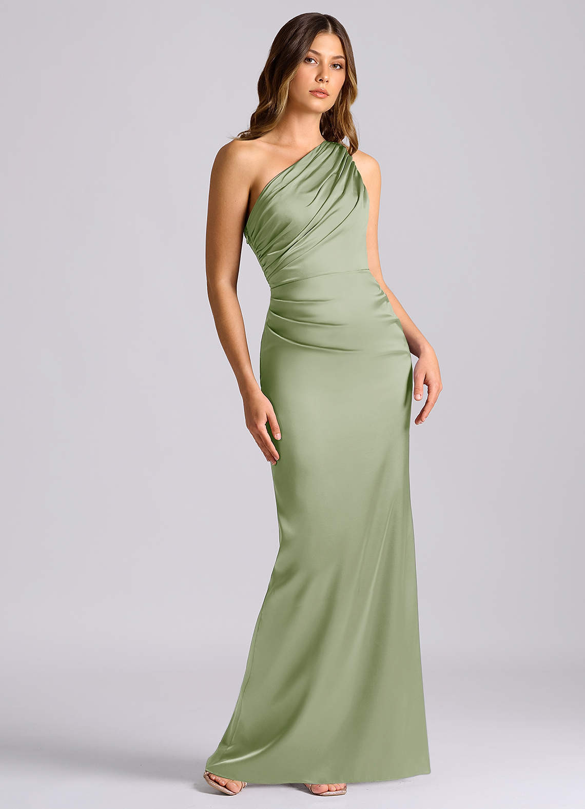 Robe Sirène en Satin extensible Une épaule Vert Sauge