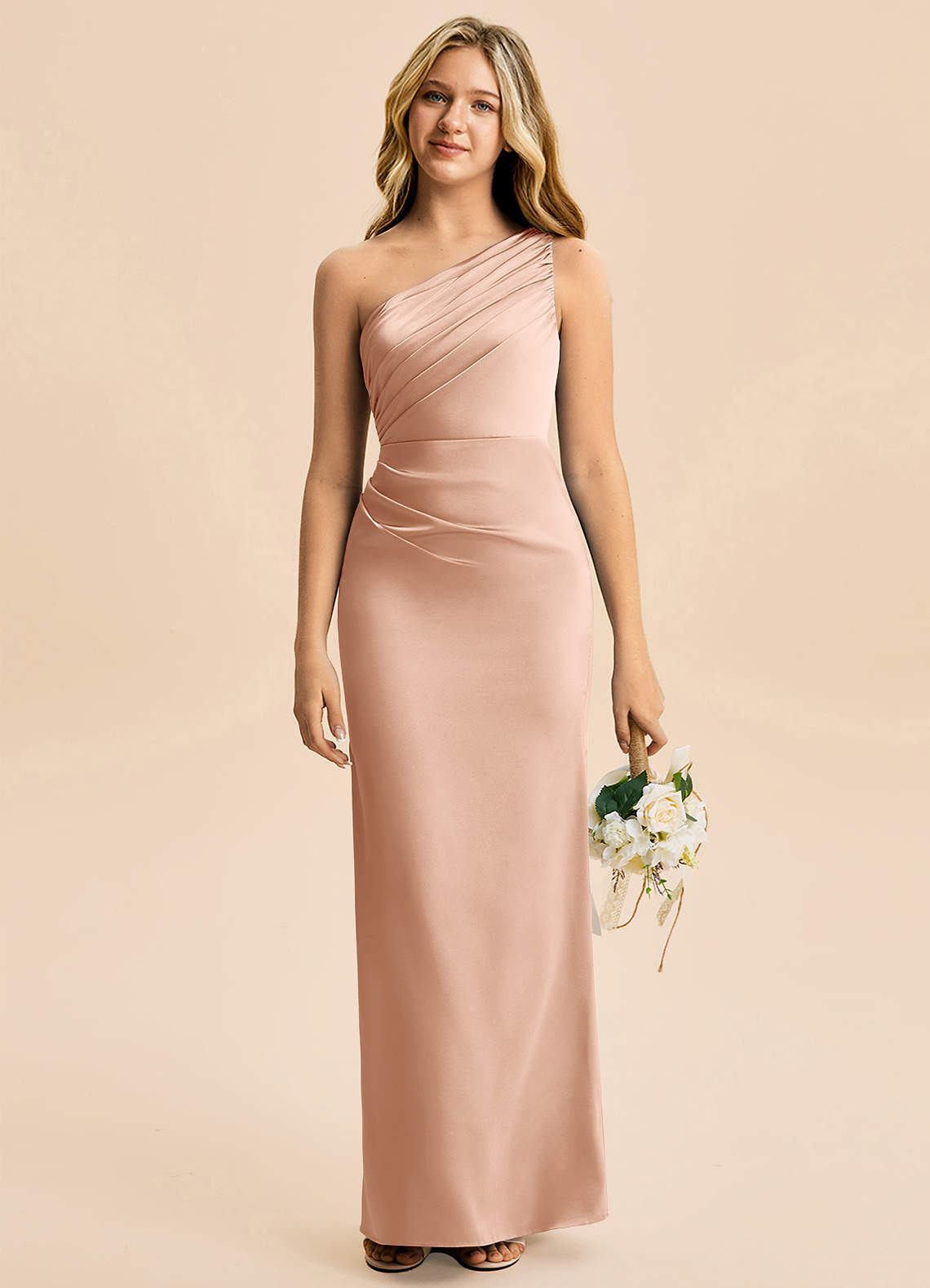 Robe Fourreau en Satin extensible Plissée Or Rose