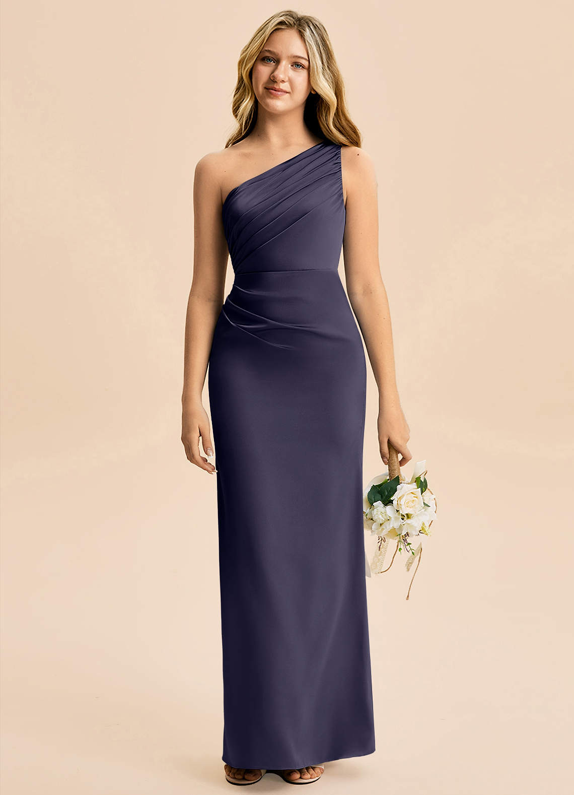 Robe Fourreau en Satin extensible Plissée Bleu Orageux